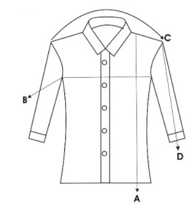 A= الطول B= محيط الصدر C= الكتف D= الكم