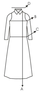 A= الطول B= محيط الصدر C= محيط الخصر D= الكتف